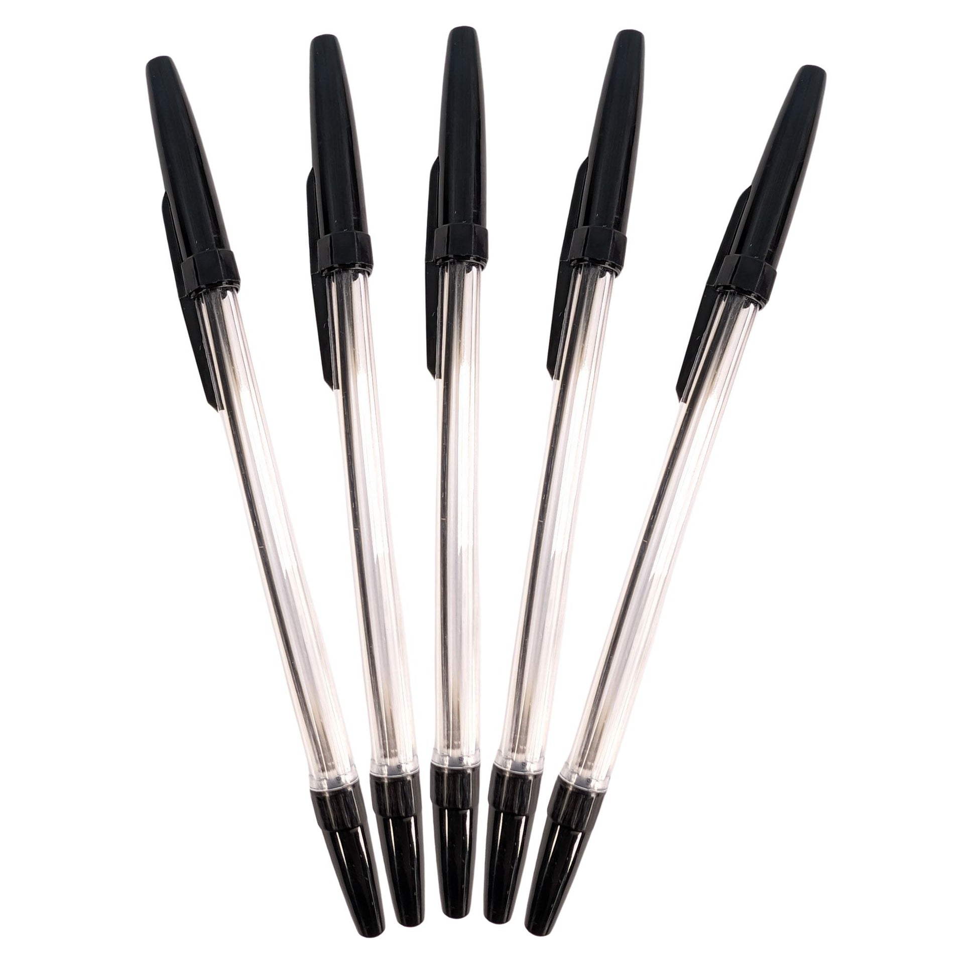 A pack of 5 black ink ballpoint pens, they use a small rotating ball to dispense oil-based ink onto the writing surface. The ink dries quickly, reducing smudging.