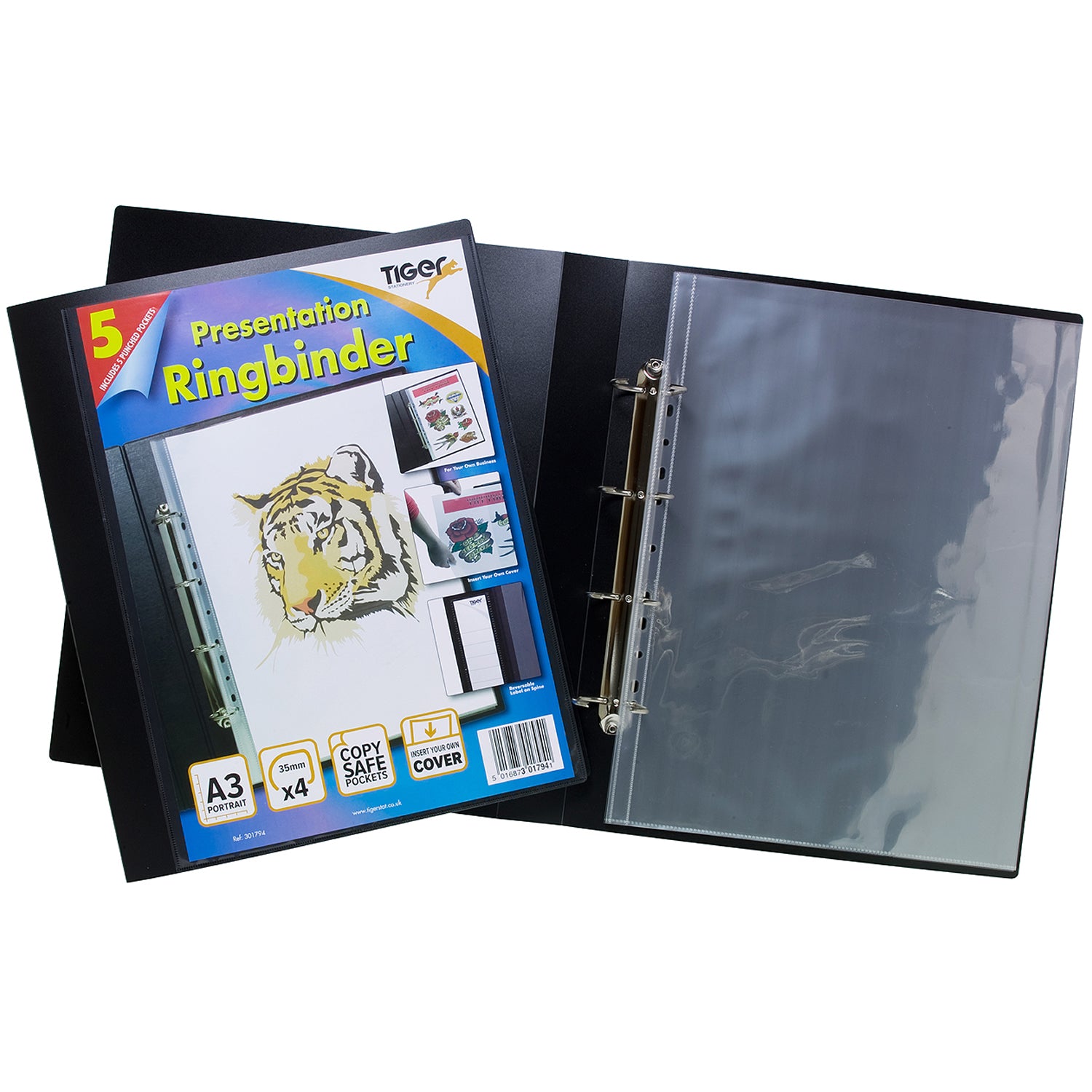 An A3 sizes presentation file great for showing past work or current themes. The black folder comes with 5 clear punch pockets which are copysafe and acid free. The spine is 50 in width with a 4-D ring mechanism. The front has a clear pockets so you can personalise the folder
