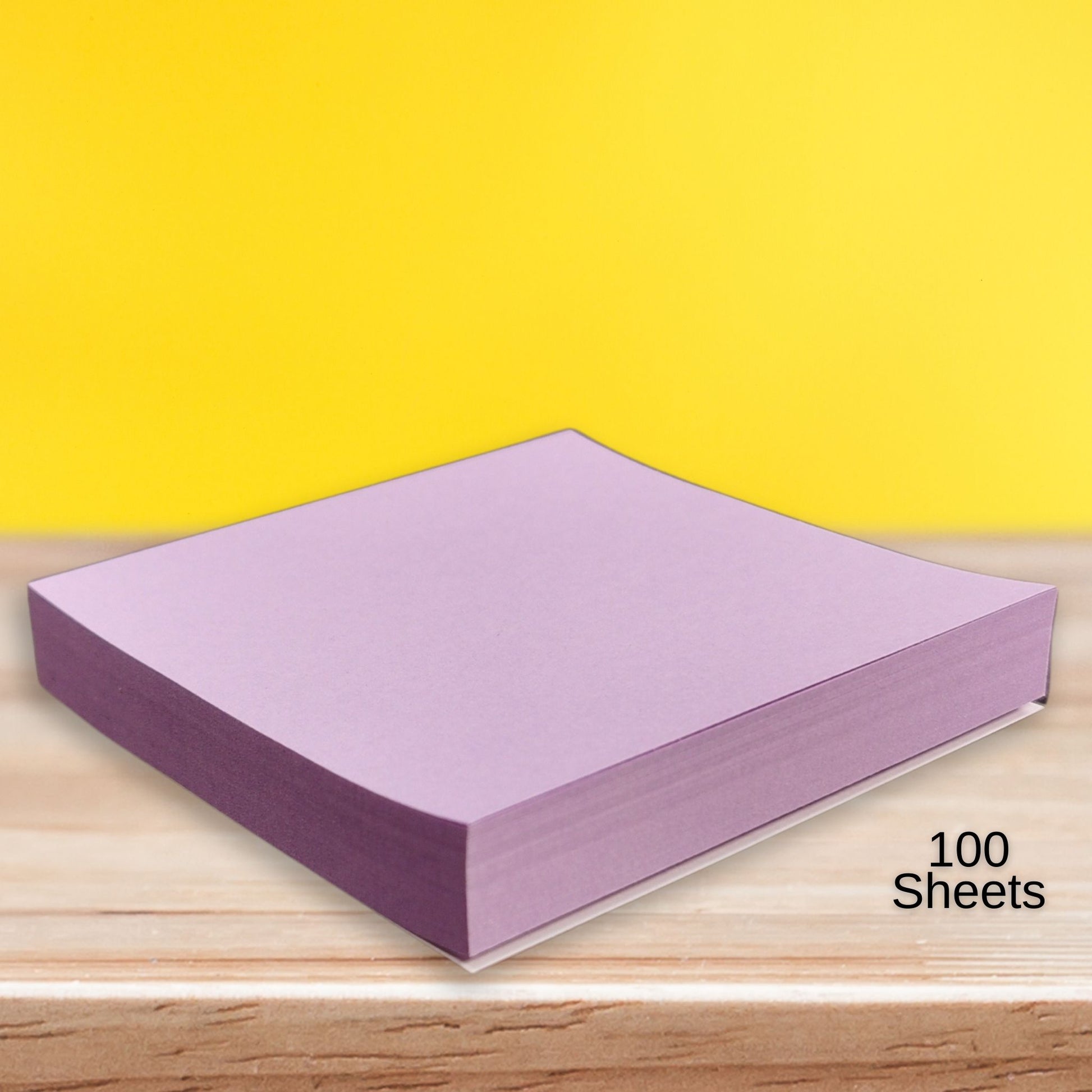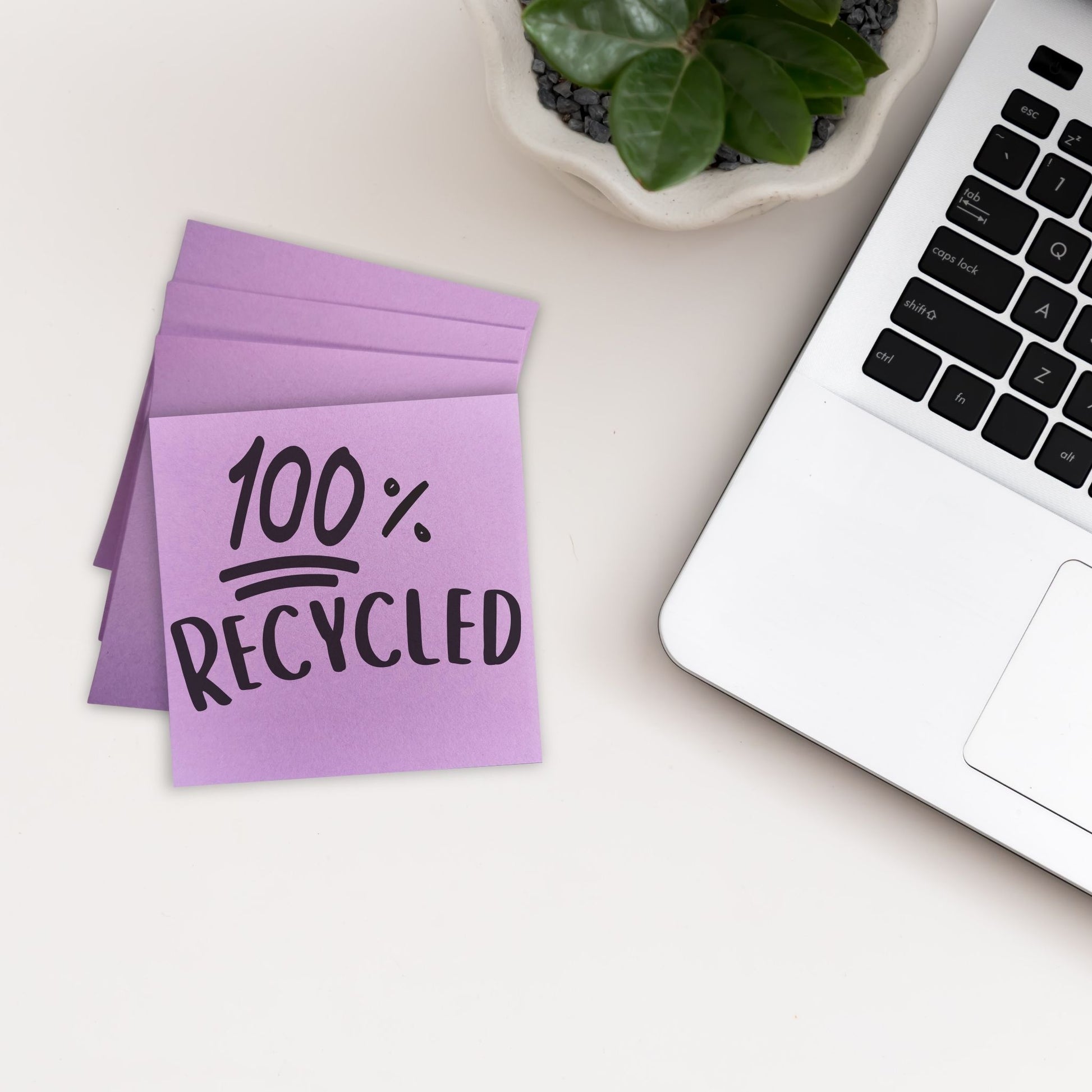 100 Pastel purple/lilac sticky notes. Designed for eco-conscious individuals and professionals, these notes are sustainably produced and made from 100% recycled content, they represent a commitment to environmental responsibility.