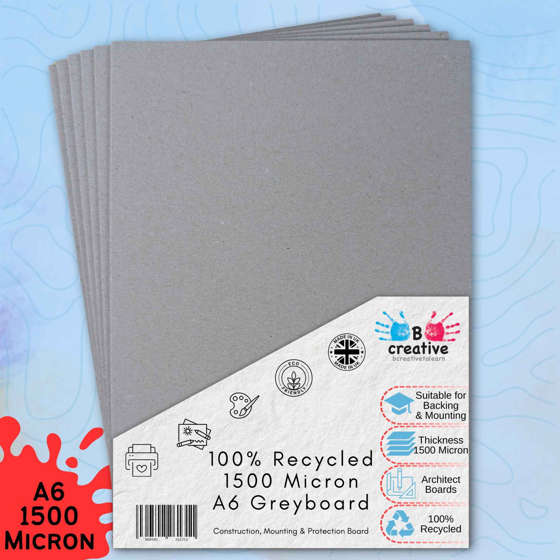 Our A6 greyboard is a strong, rigid board made from 100% recycled fibres, ideal for craft, art, mounting and model making. At 1500 micron (1.5 mm), these heavyweight sheets provide excellent stiffness and durability for classroom and studio use.