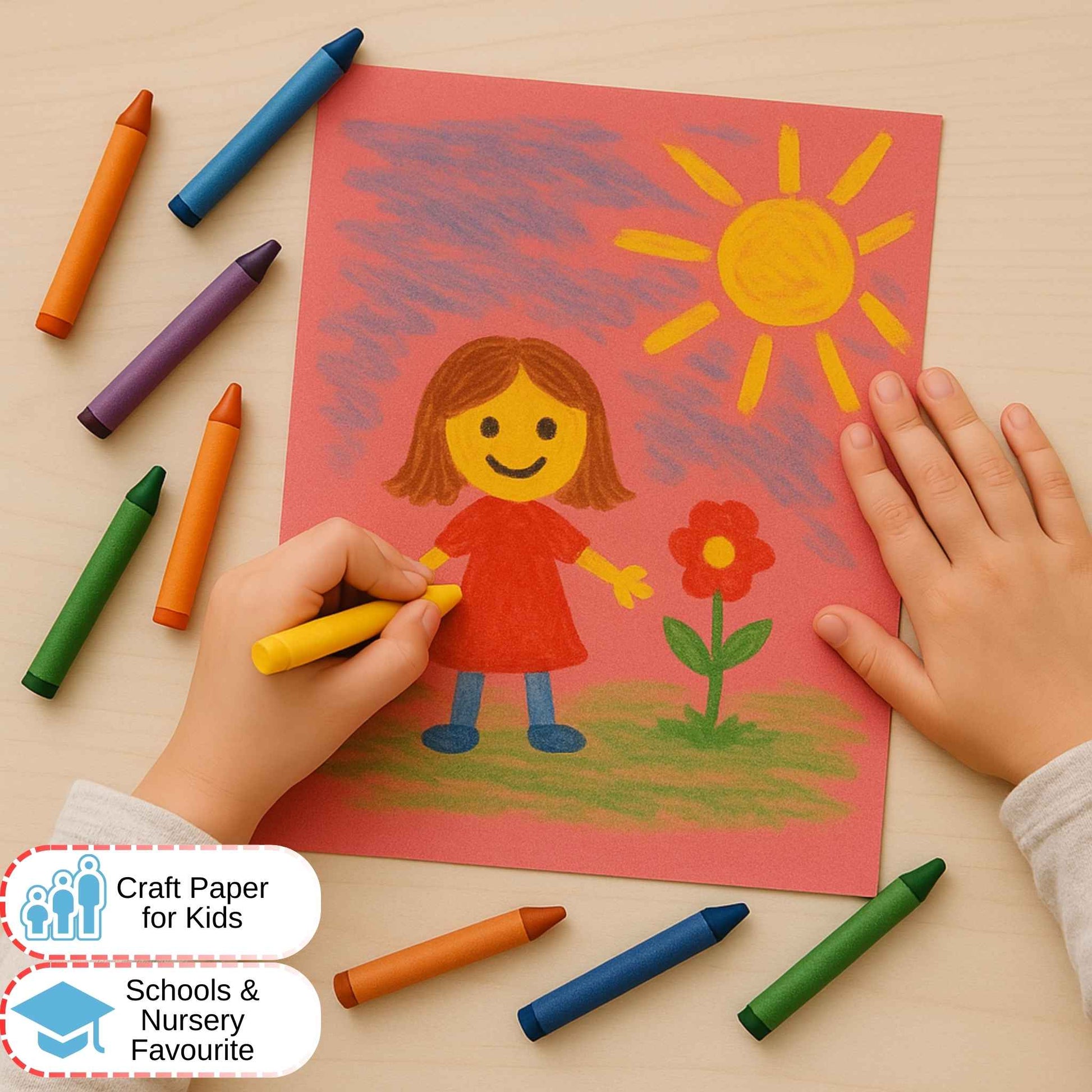 This sugar paper has a slightly raised textured feel and is the perfect painting paper for children art & crafts. Such as drawing, Ideal to use with PVA or pritt stick glue sticking, scrap booking, hand printing & drawing.