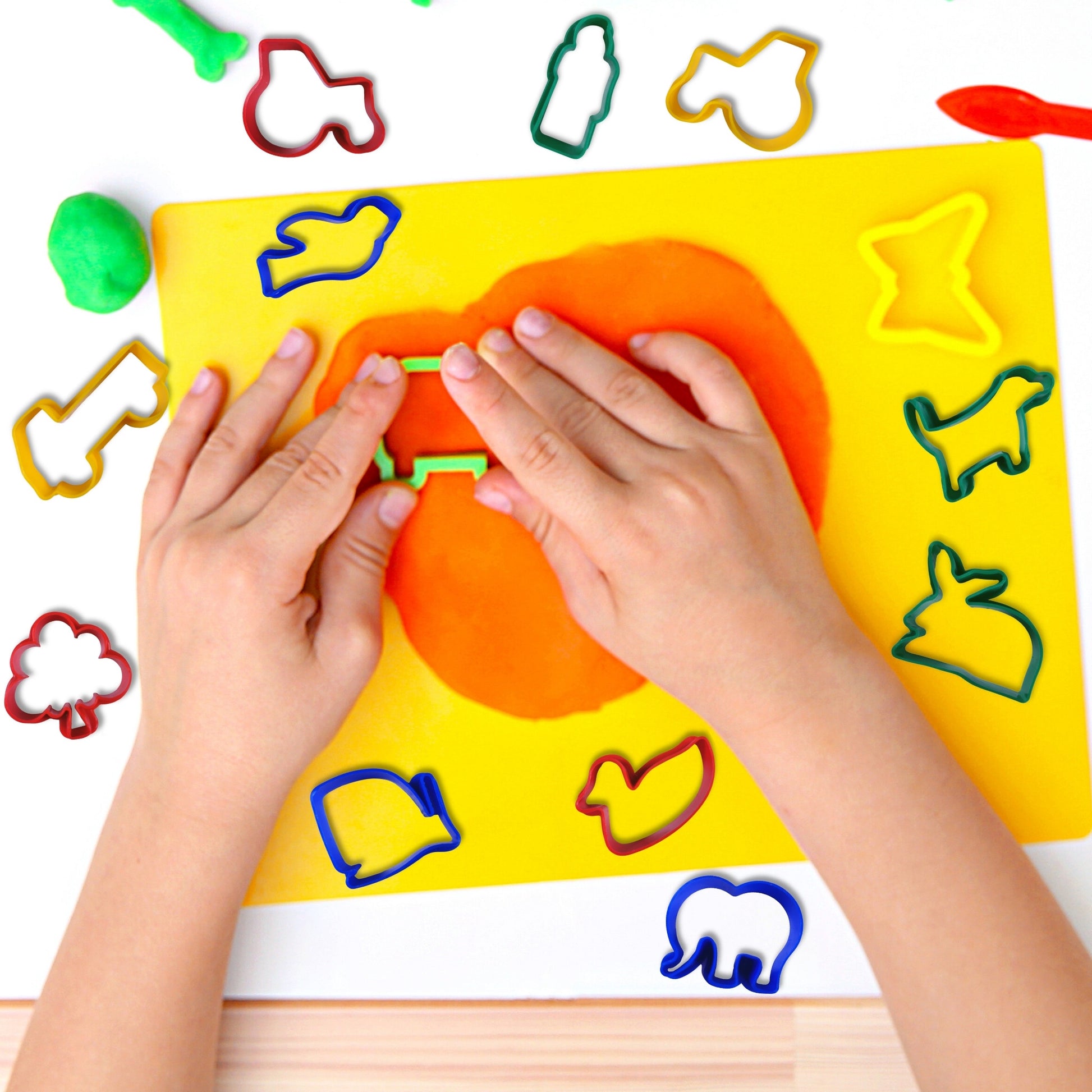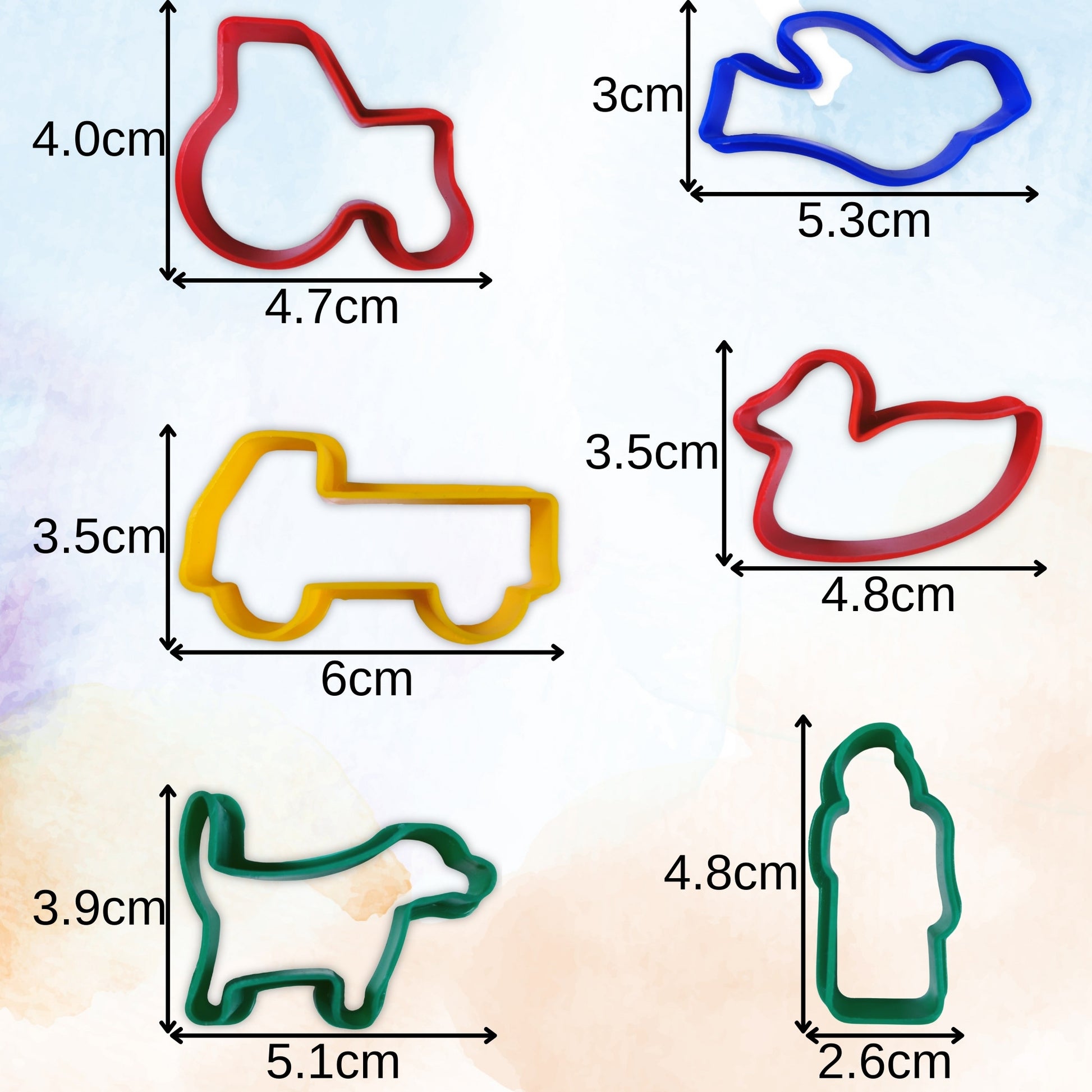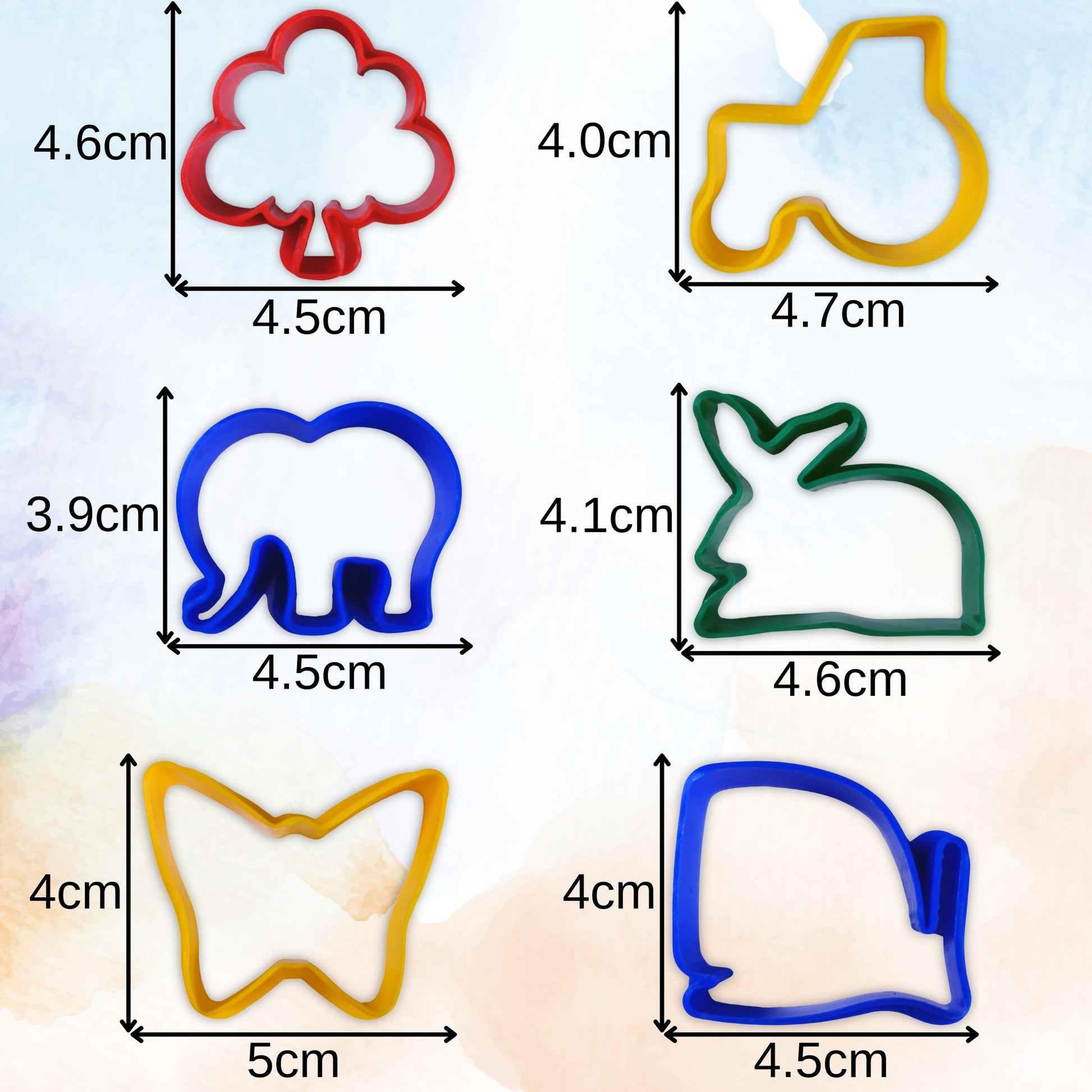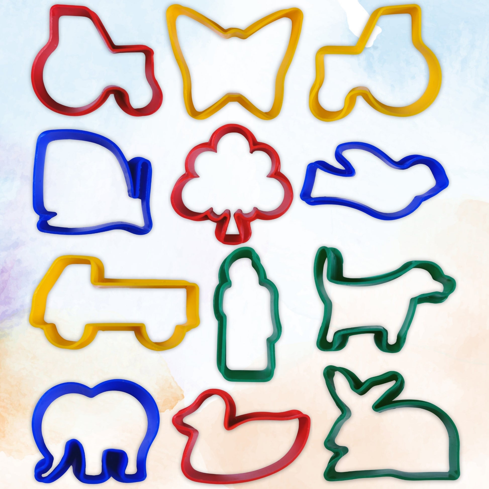 A set of 12 bright colour plastic playdough cutters for kids. Contains a fun selection of dough cutter shapes that includes a Rabbit, Butterfly, Snail, Elephant, Tree, Dog, Truck, Candle, Bird, Duck & two Tractors.