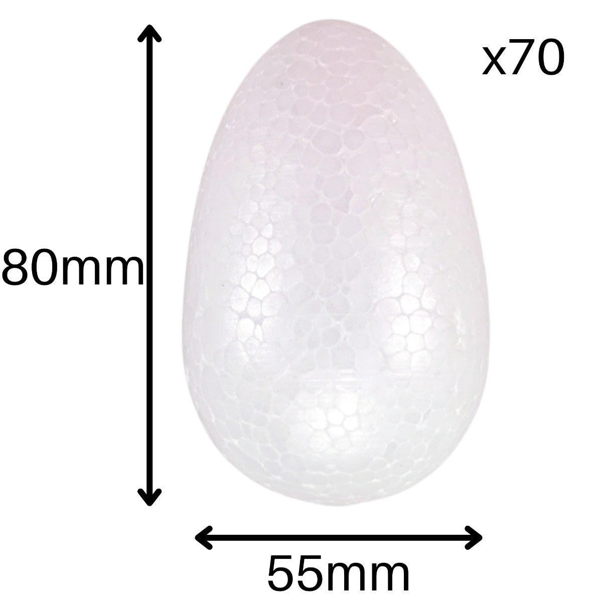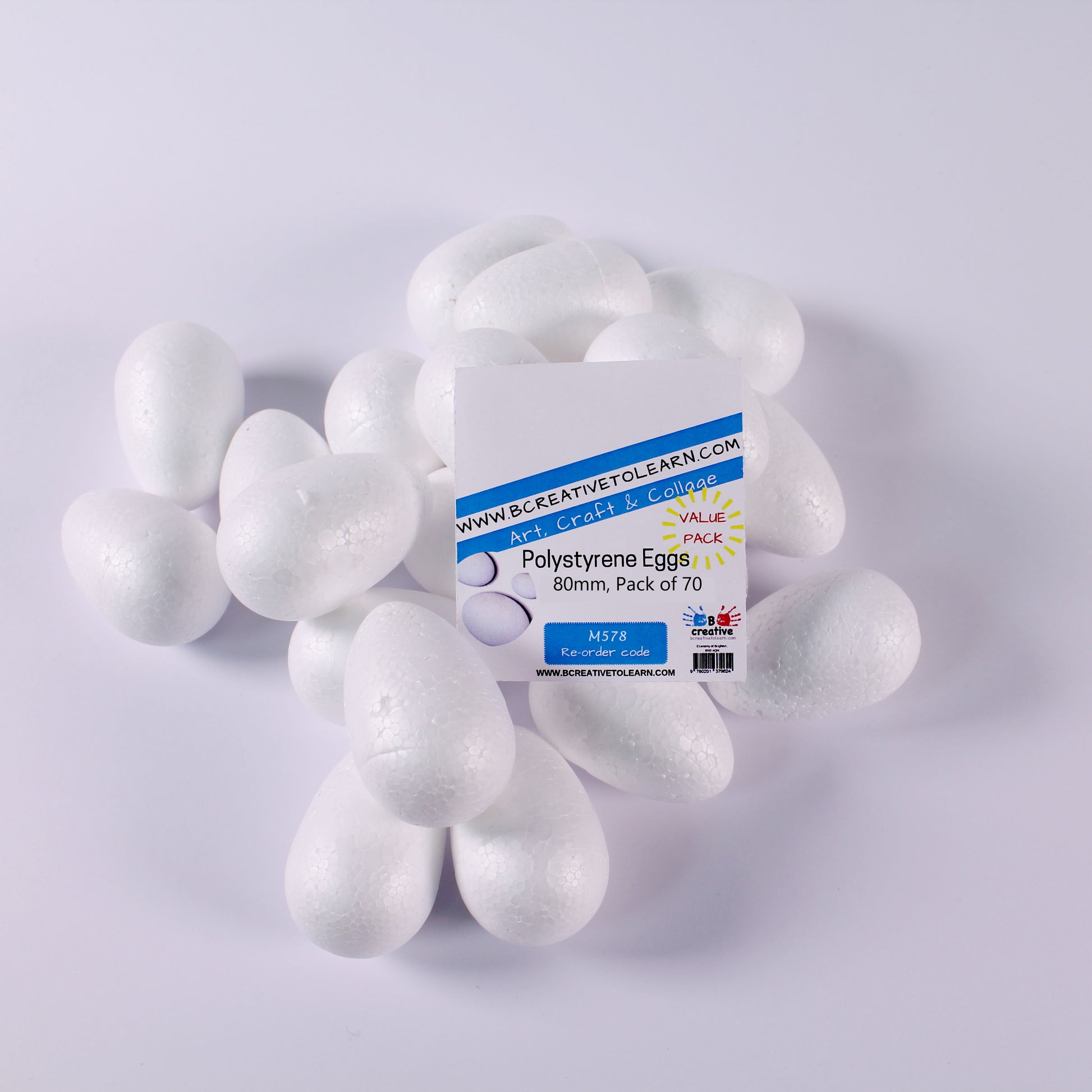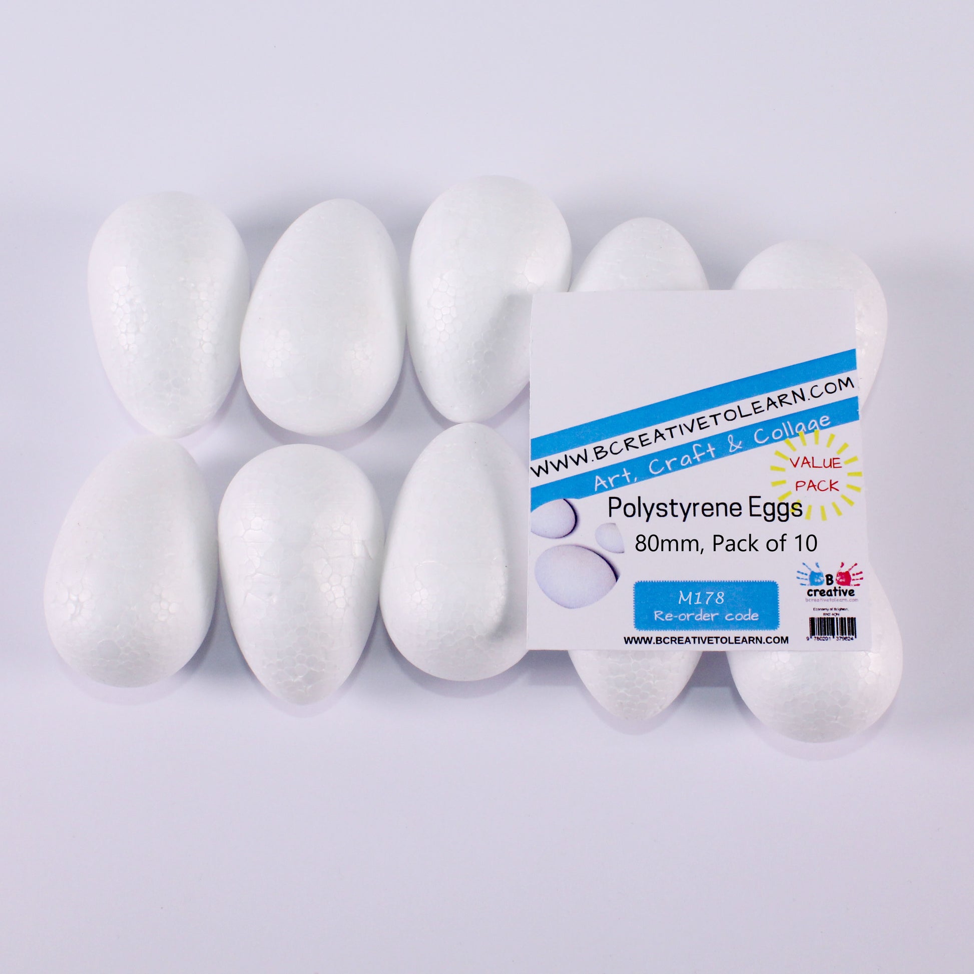 This value pack of solid 3D Polystyrene Egg shapes contains 8cm eggs measuring in at 80x55mm.